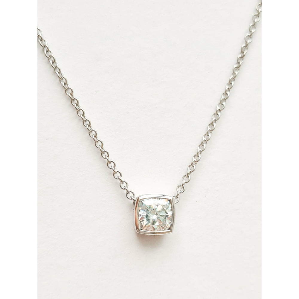 A 6mm x 6mm (approx. 1.2ct) square cushion cut moissanite pendant in a bezel setting on a 45cm rolo chain, all with a rhodium plated finish.
