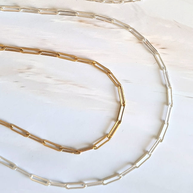 Our standard Paperclip necklace is the modern staple for a layered neck look. The chain is slightly wider than our Petite Paperclip with a width of 3.4mm.