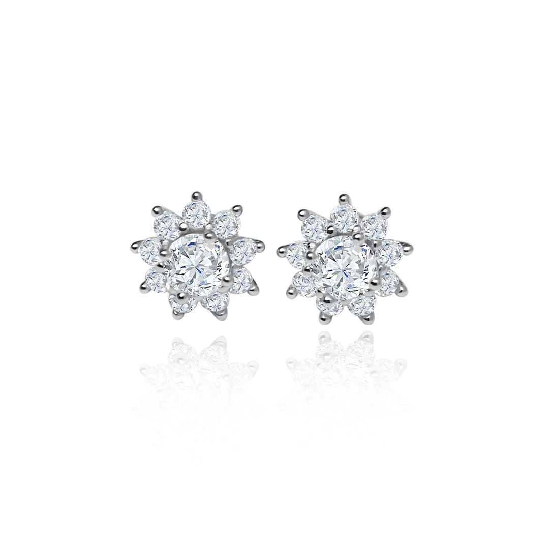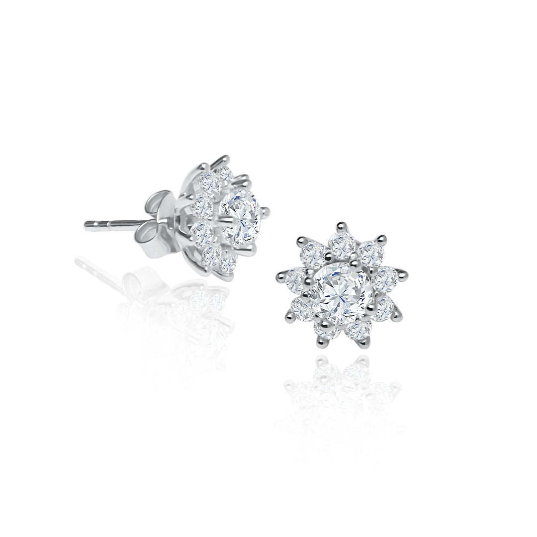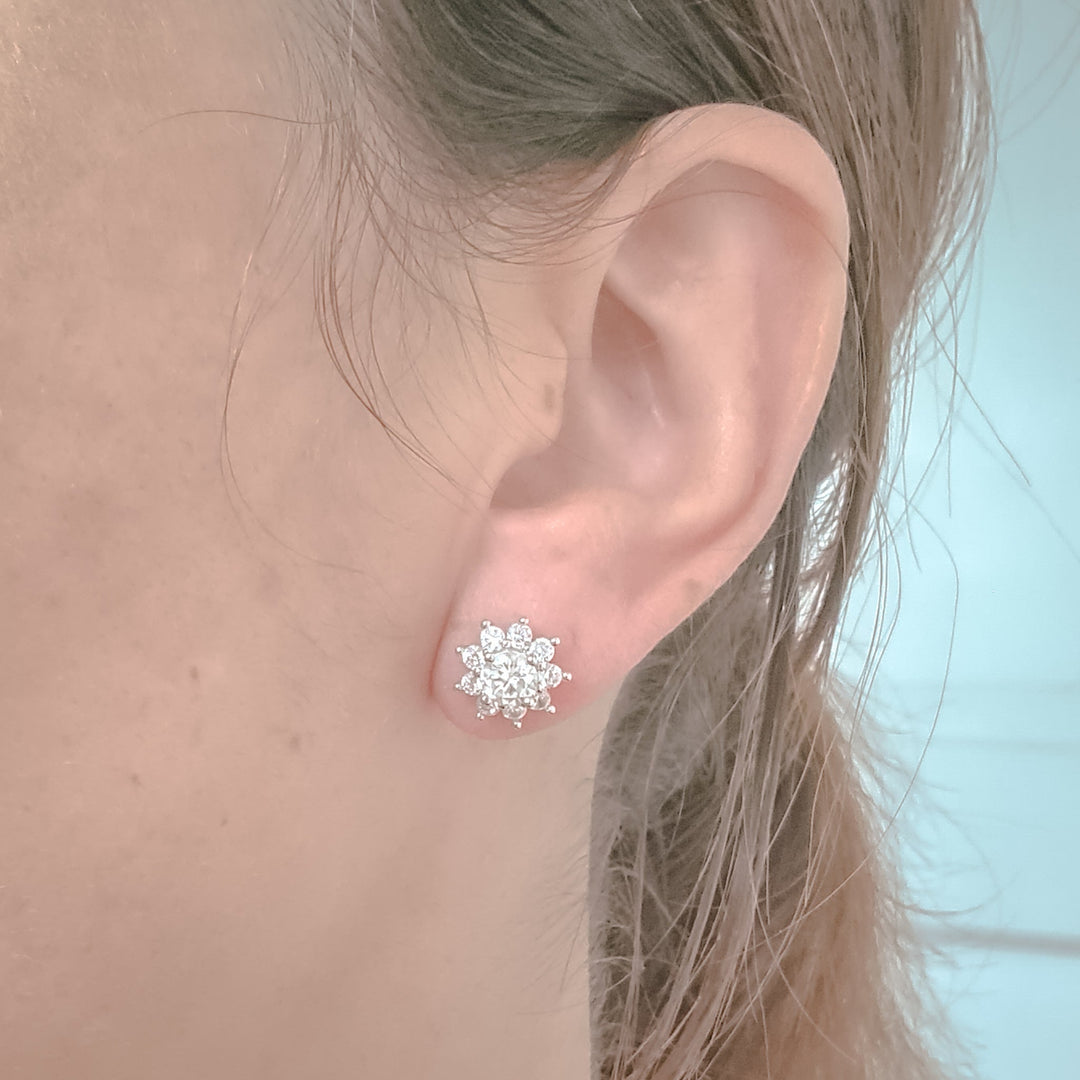 - Stones: 5mm plus nine 2.5mm brilliant round cut moissanites per earring (total pair weight approximately 2.8ct)