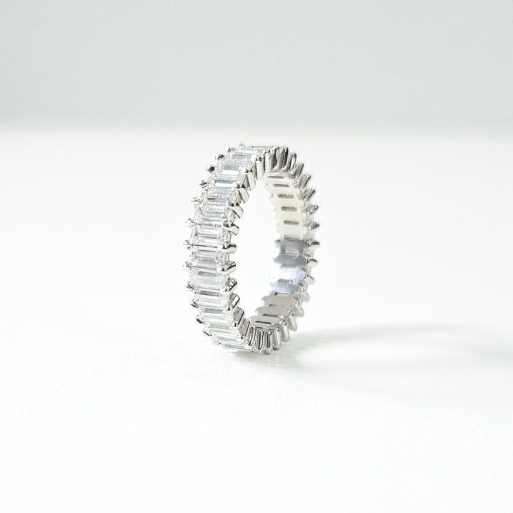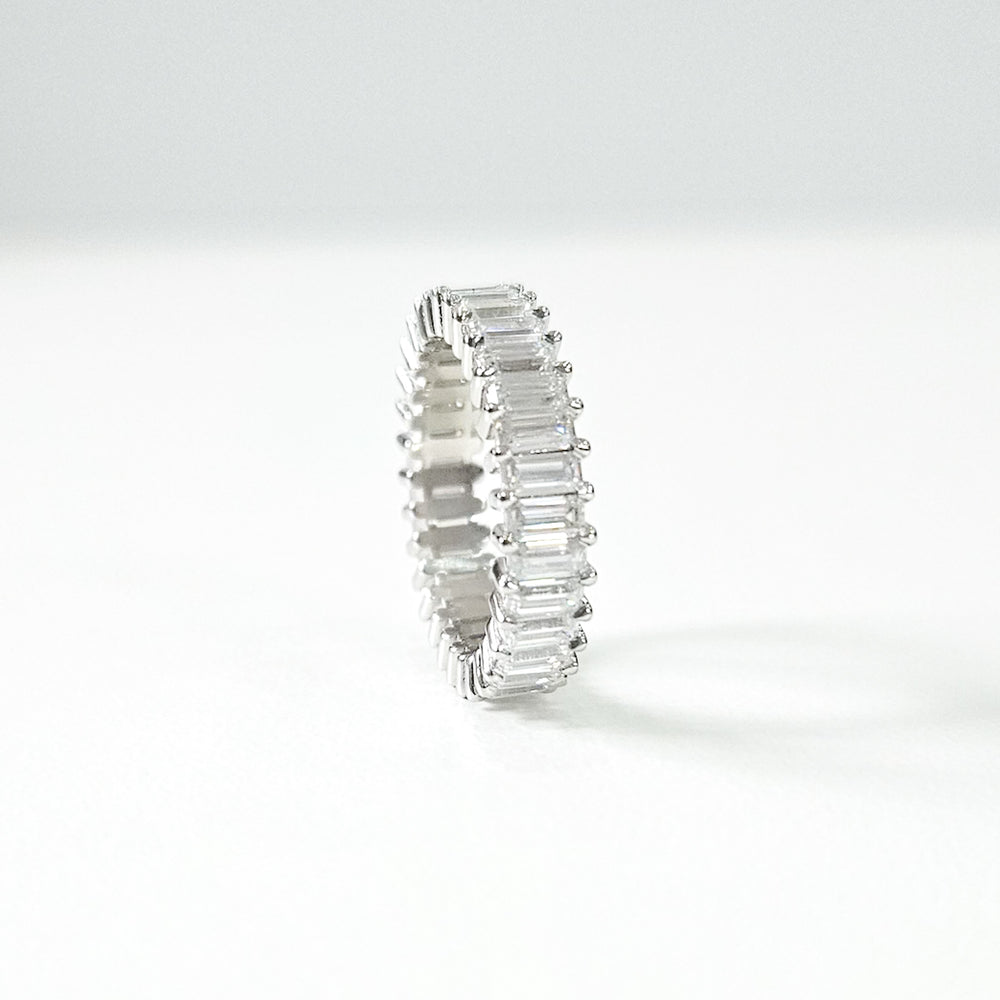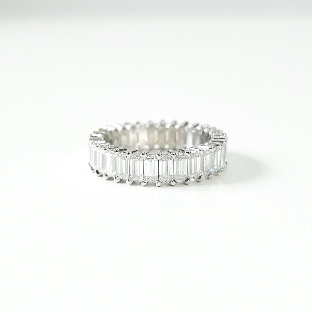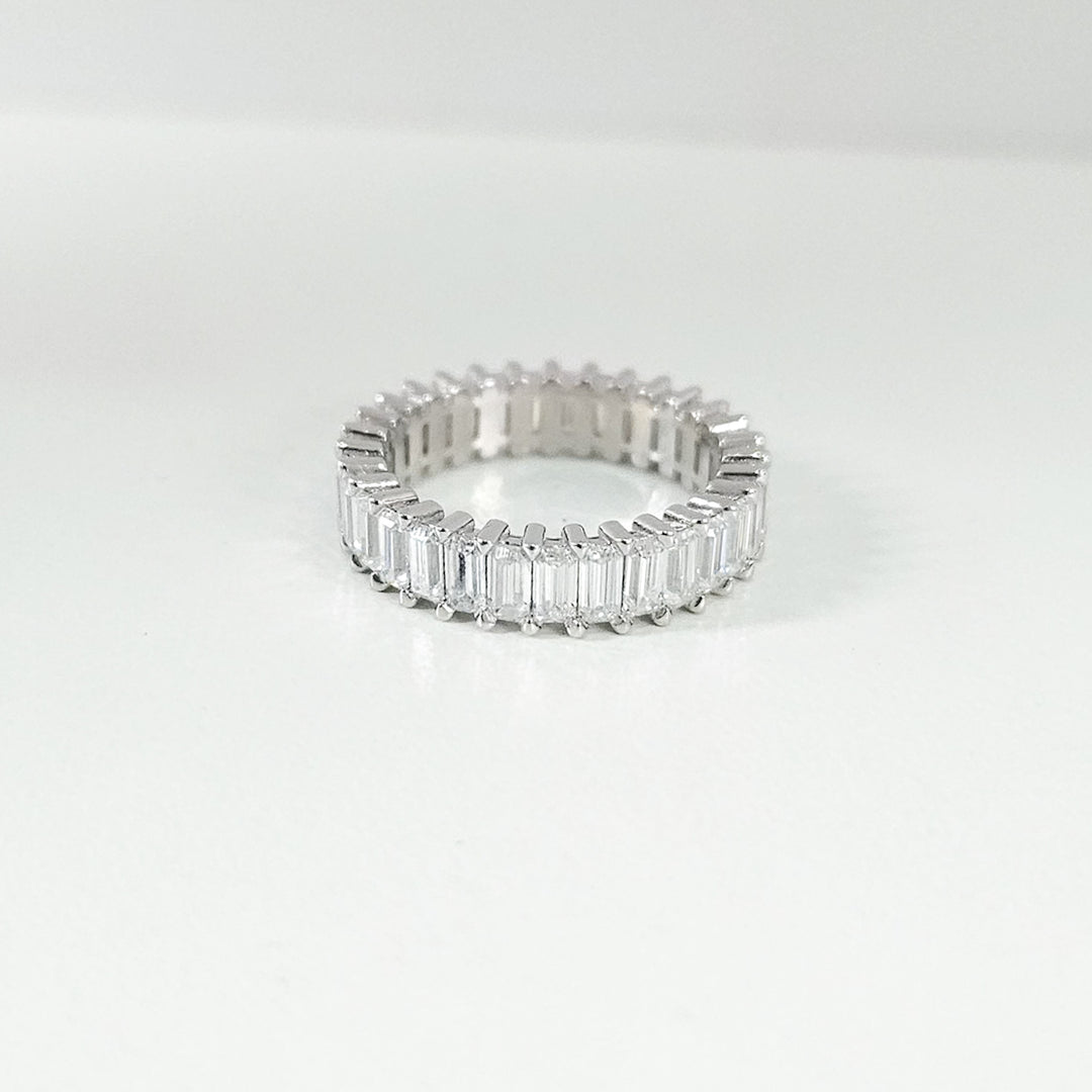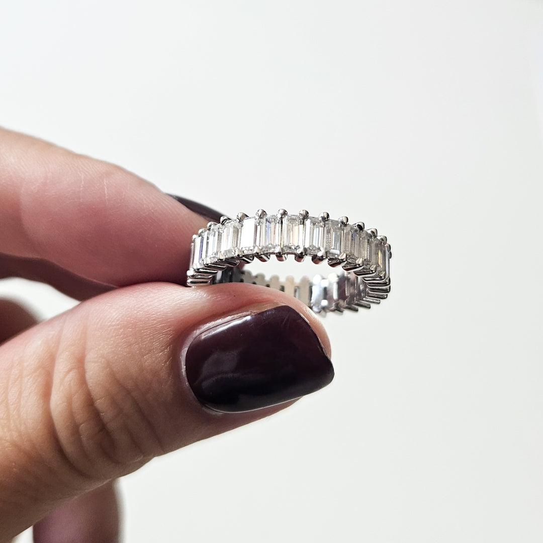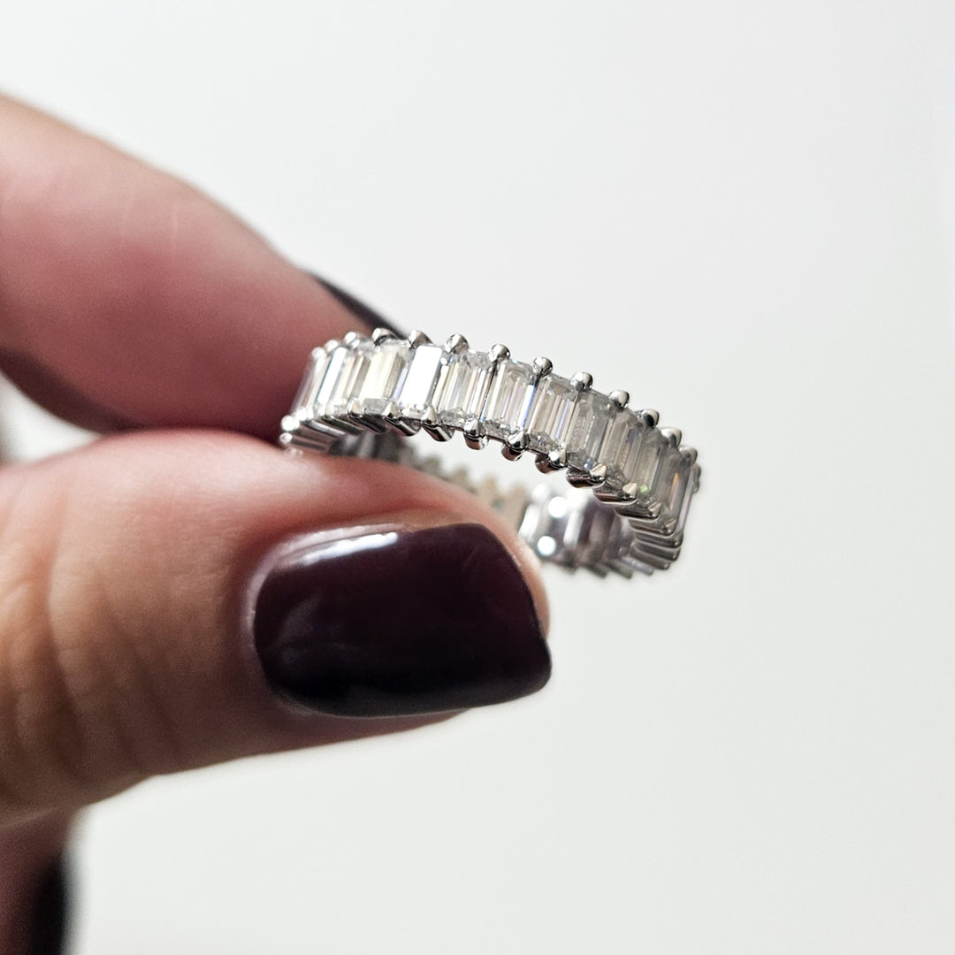 Made from high-quality 9k gold and featuring a full eternity band of sparkling 4mm x 2mm emerald cut moissanite stones, this ring is a wonderful heirloom piece and extremely versatile.