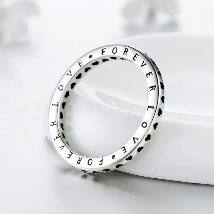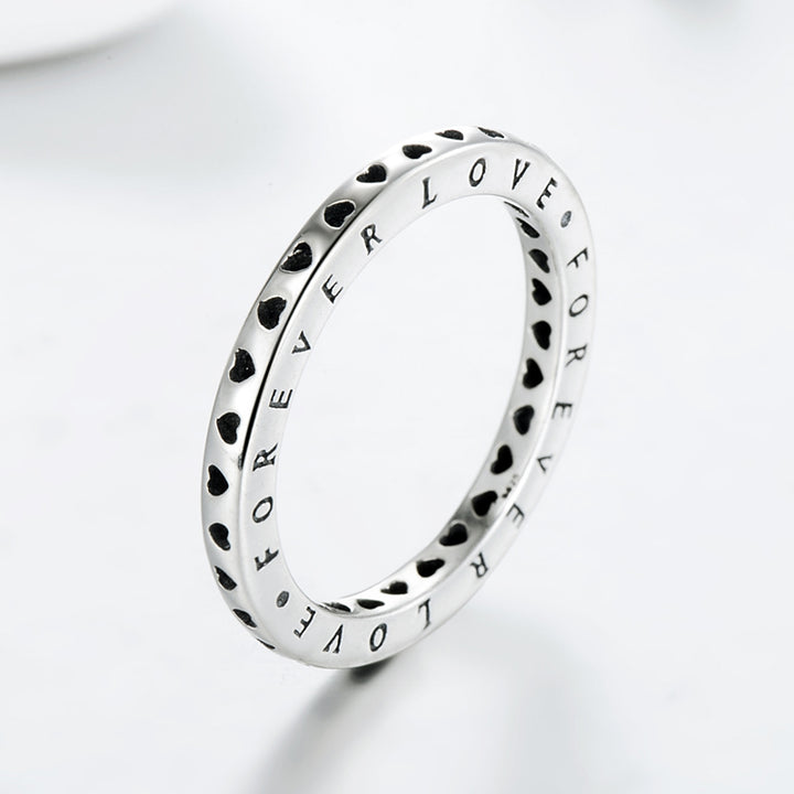 A beautifully detailed sterling silver ring with heart cut outs and an engraved message of love on the 2.5mm wide band to remind you of your Forever Love when you wear it.