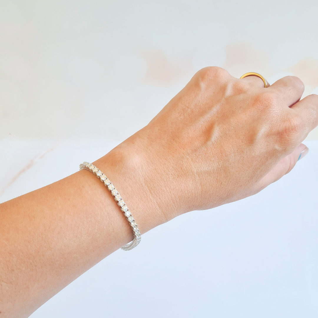 Enjoy timeless elegance with a 3mm round moissanite set tennis bracelet in sterling silver - a classic centerpiece in your jewellery collection.
