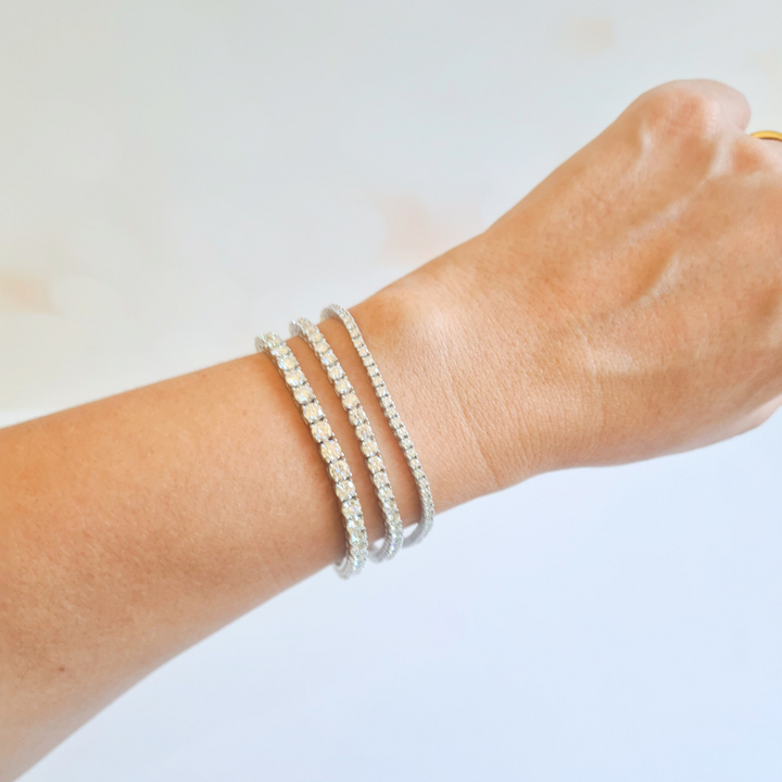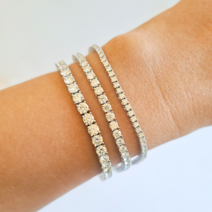 Steal the show with our Midi Moissanite Tennis Bracelet, featuring over 4 carats of sparking 3mm round moissanites set in sterling silver. Classic design meets modern sophistication.