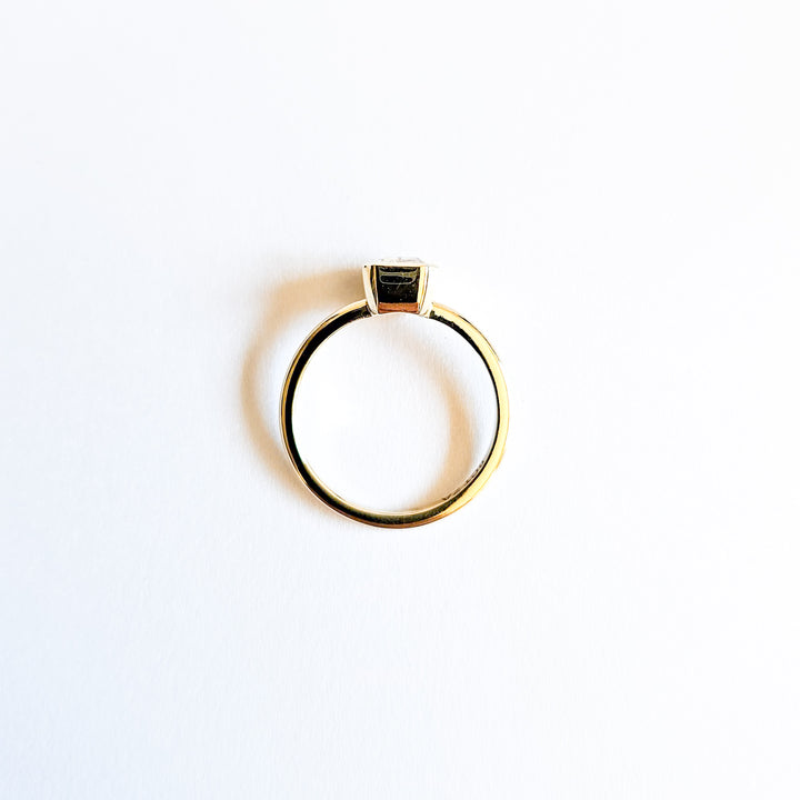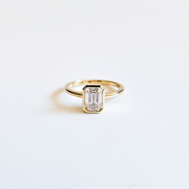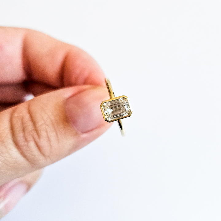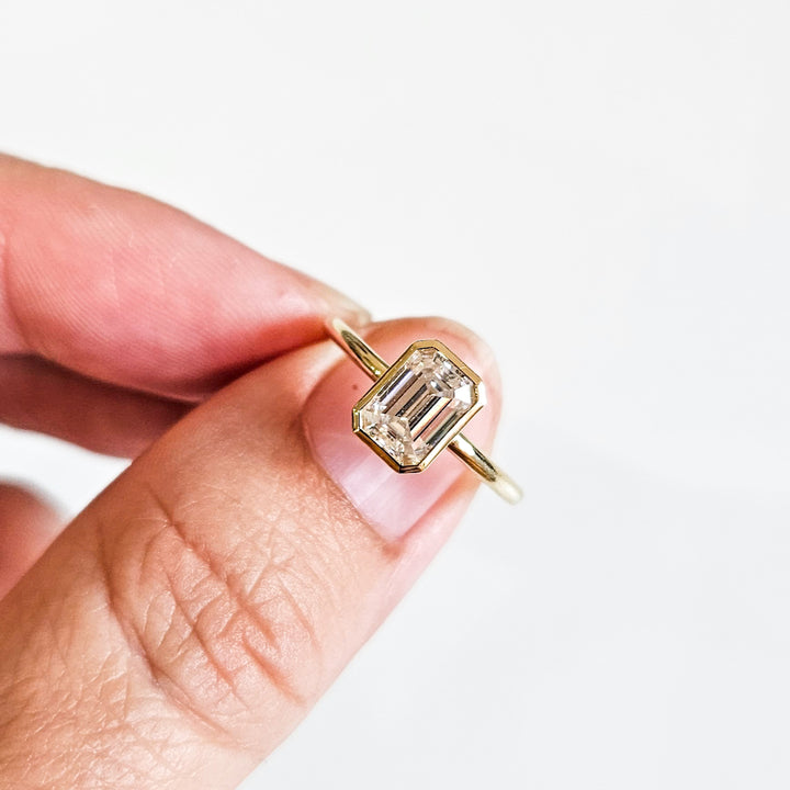 This stunning bezel set Emerald Cut Moissanite Ring will steal your heart with its 1ct total carat weight and minimalist design. The ring features a 7mm x 5mm emerald cut moissanite.