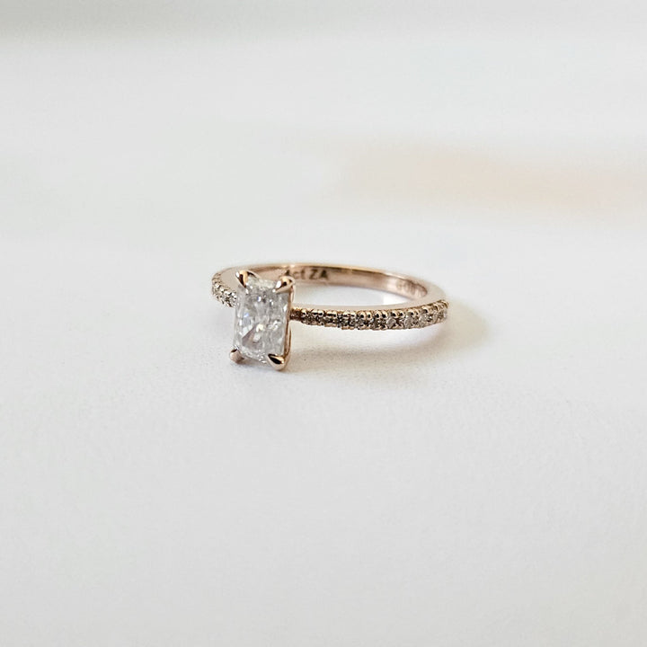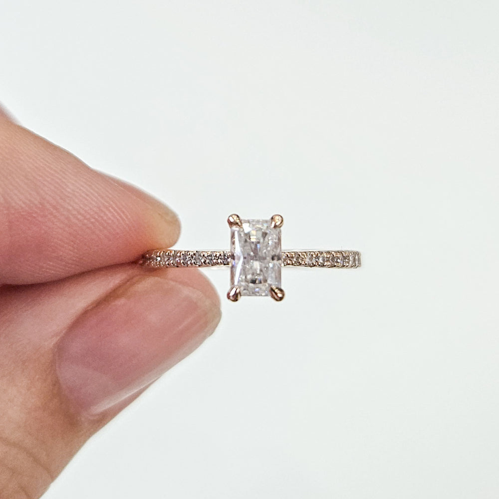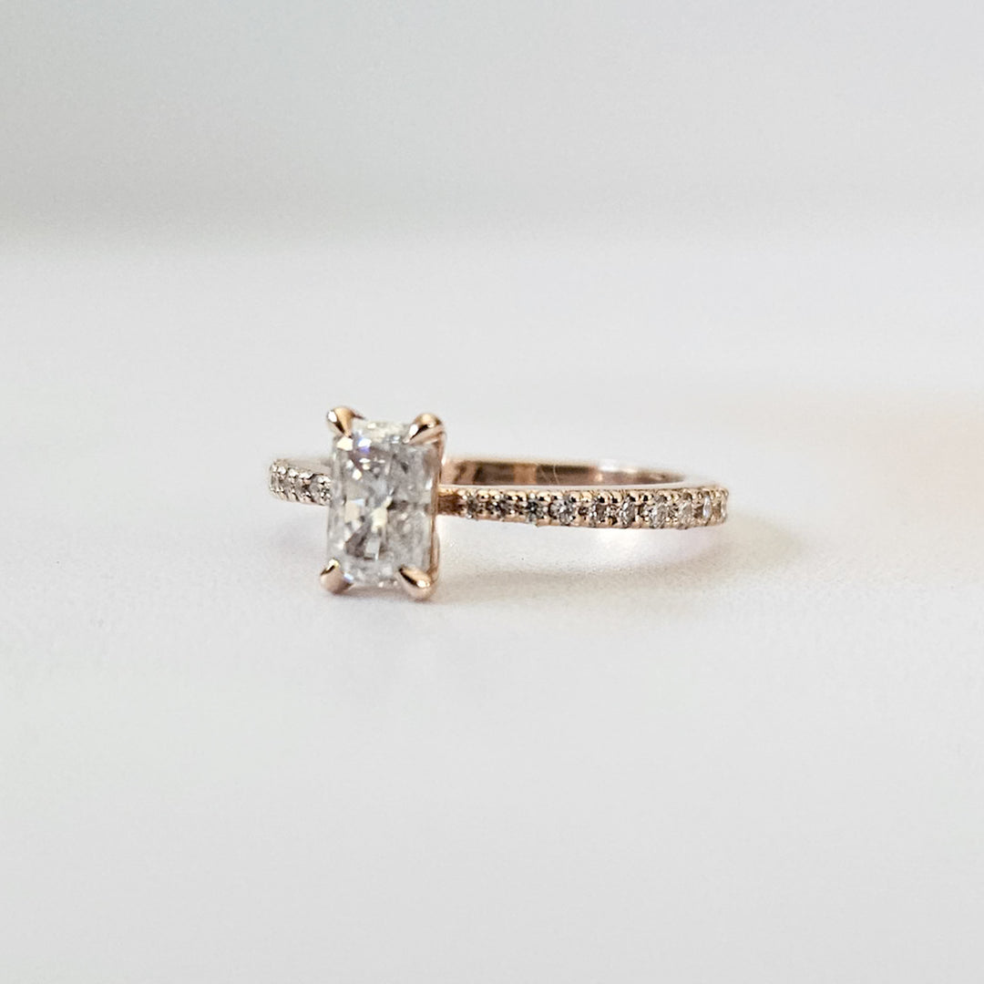Sometimes, smaller can be better when you achieve perfect proporsions and faultless finishing. A 4 x 6mm radiant cut centre stone with a micropave tapered shank. Available in 9k gold and sterling silver.