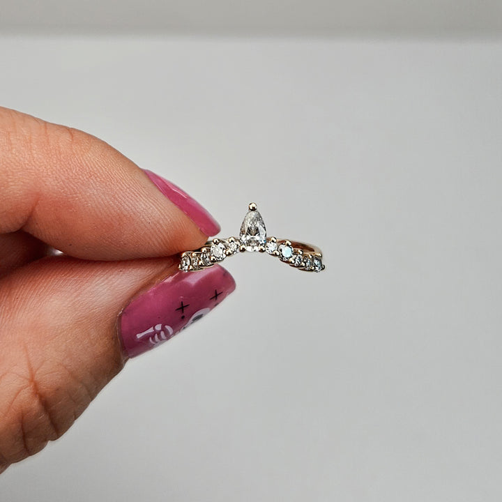 Our Tiara Curved ring perfectly fits low set solitaire rings, and is stunning worn solo. Set with round and pear cut moissanites, its a real show stopper wedding or anniversary ring.