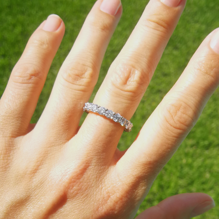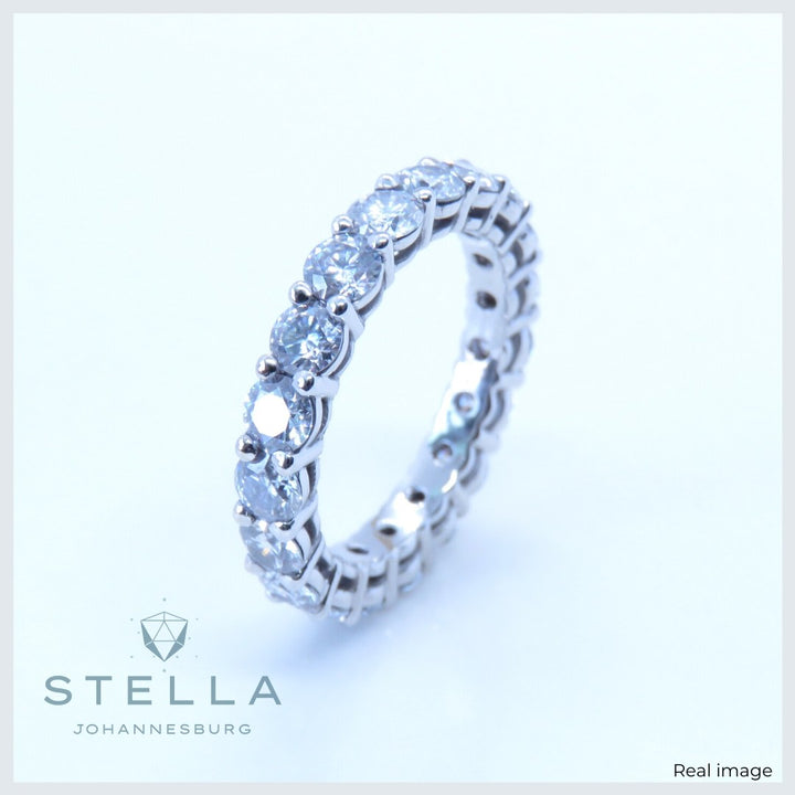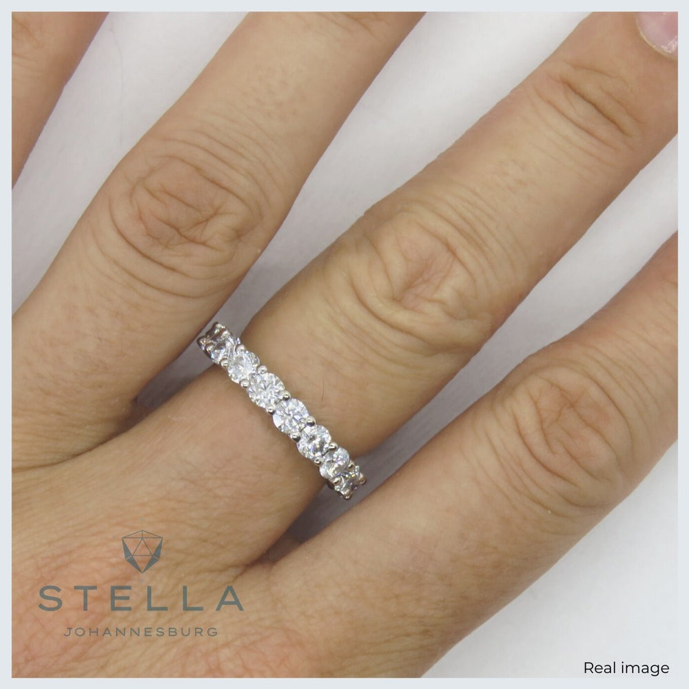 Introducing our Classic Round Moissanite Full Eternity Band. Made with 3.00 cts of 3.5mm round moissanite stones (19 in total) set in 9k Gold, this 3.5mm band will add a touch of timeless elegance to any outfit.