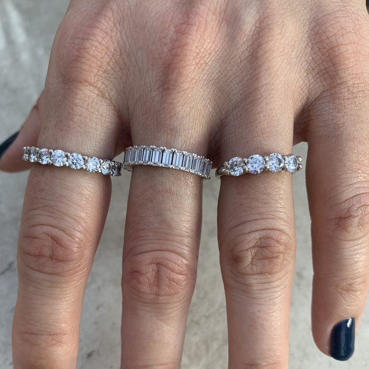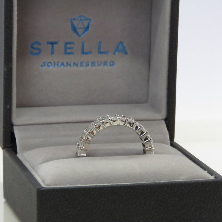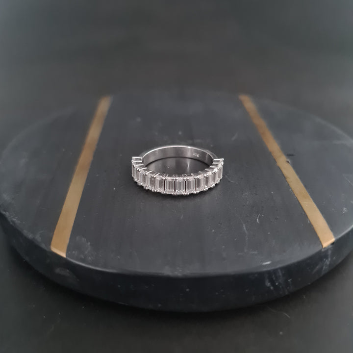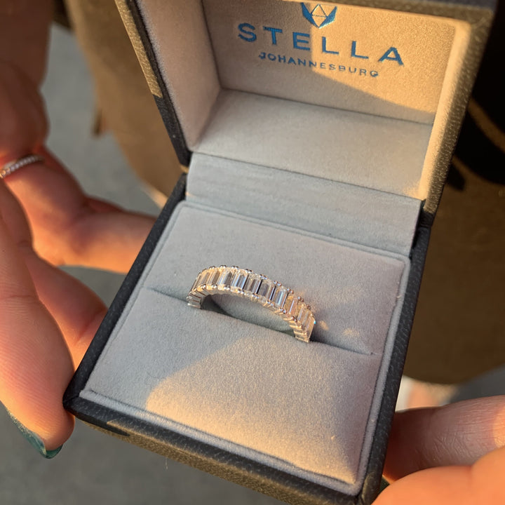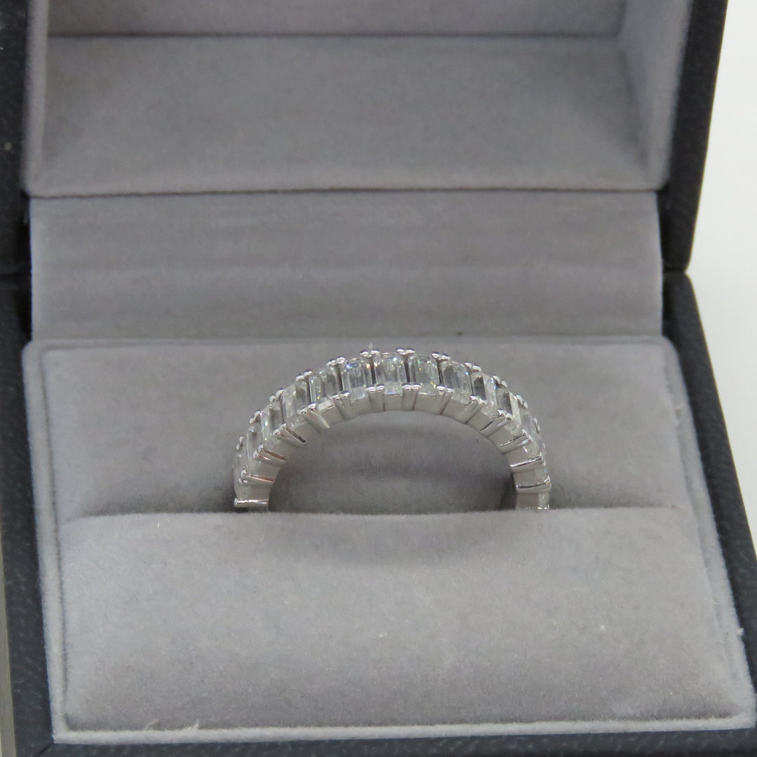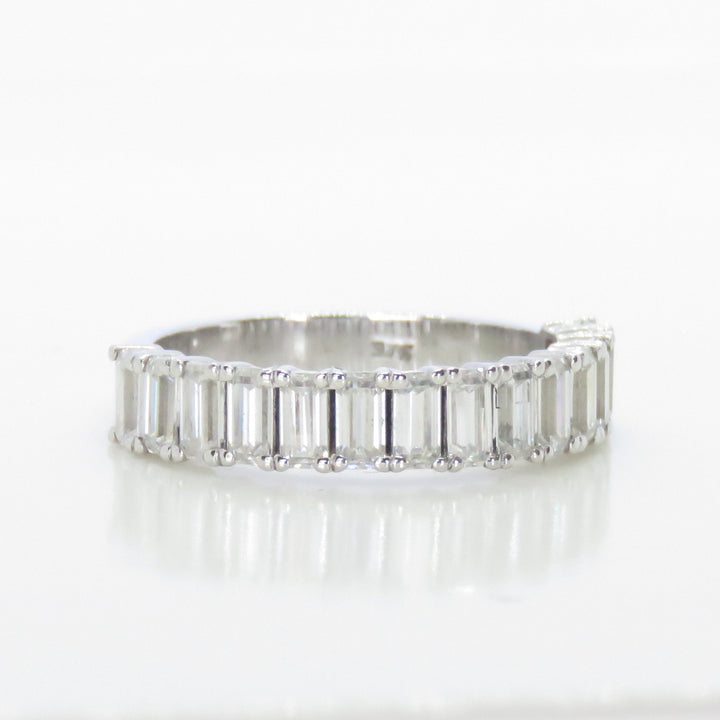 Made from high-quality 9k gold and featuring 14 sparkling 4mm x 2mm emerald cut moissanite stones, with a total carat weight of 1.50 cts, this ring is truly one-of-a-kind. With a 4mm band, it's both comfortable to wear and eye-catching.