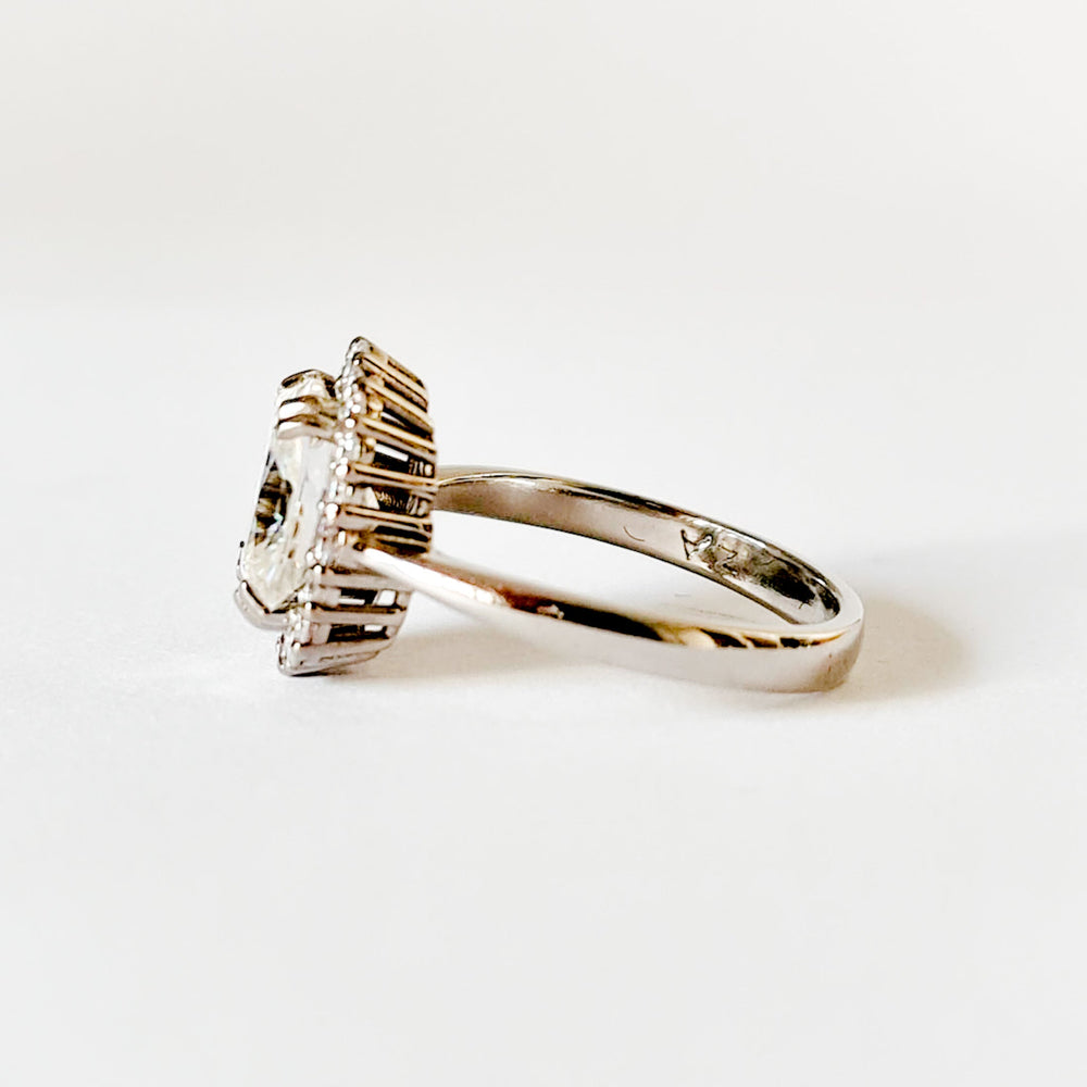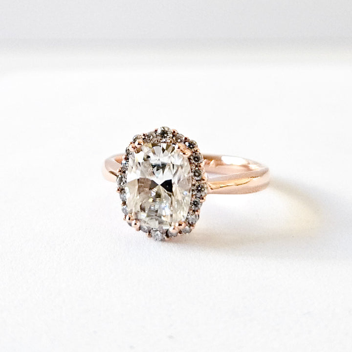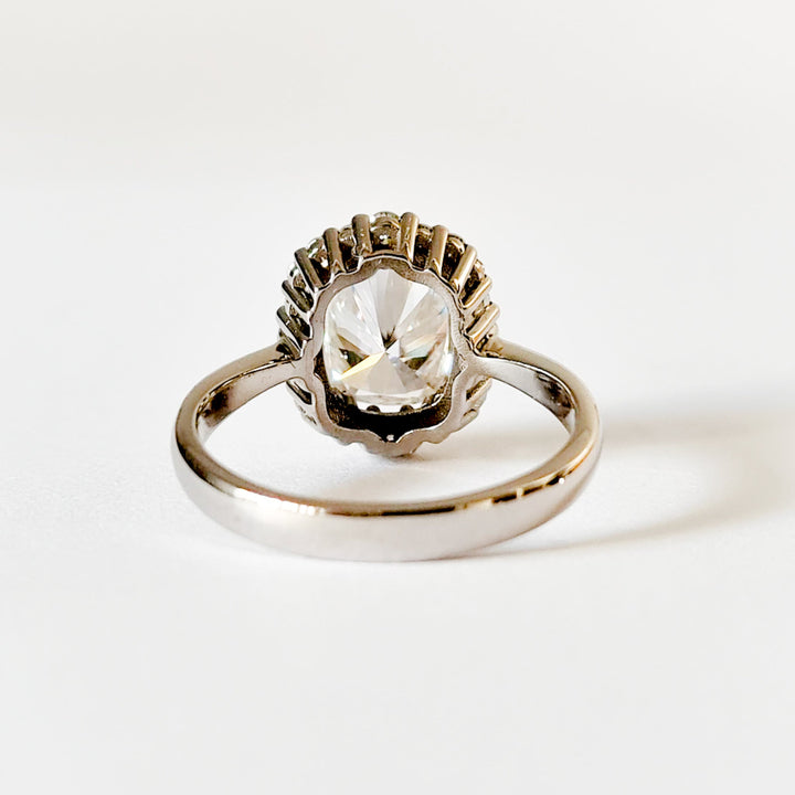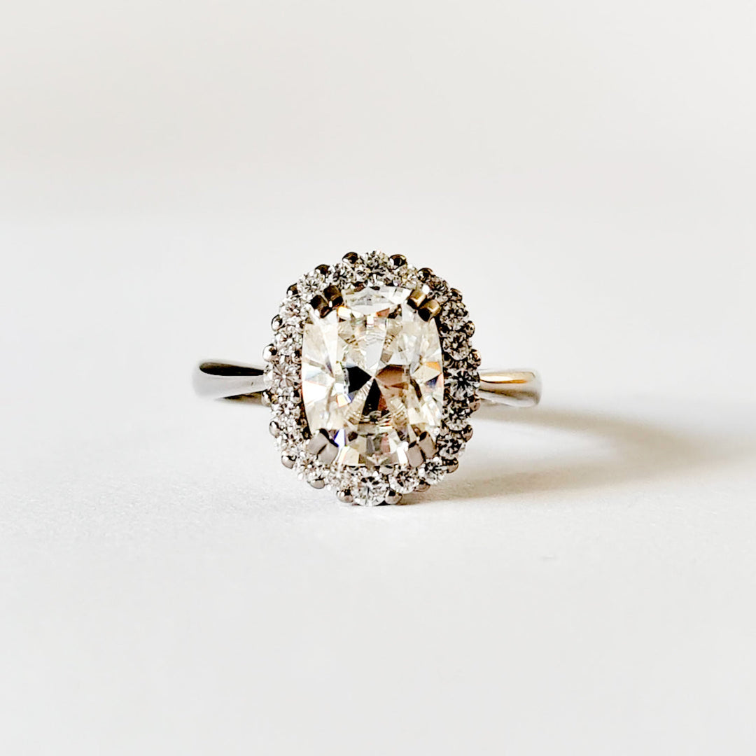 • Moissanite: 9mm x 7mm cushion (1), halo.