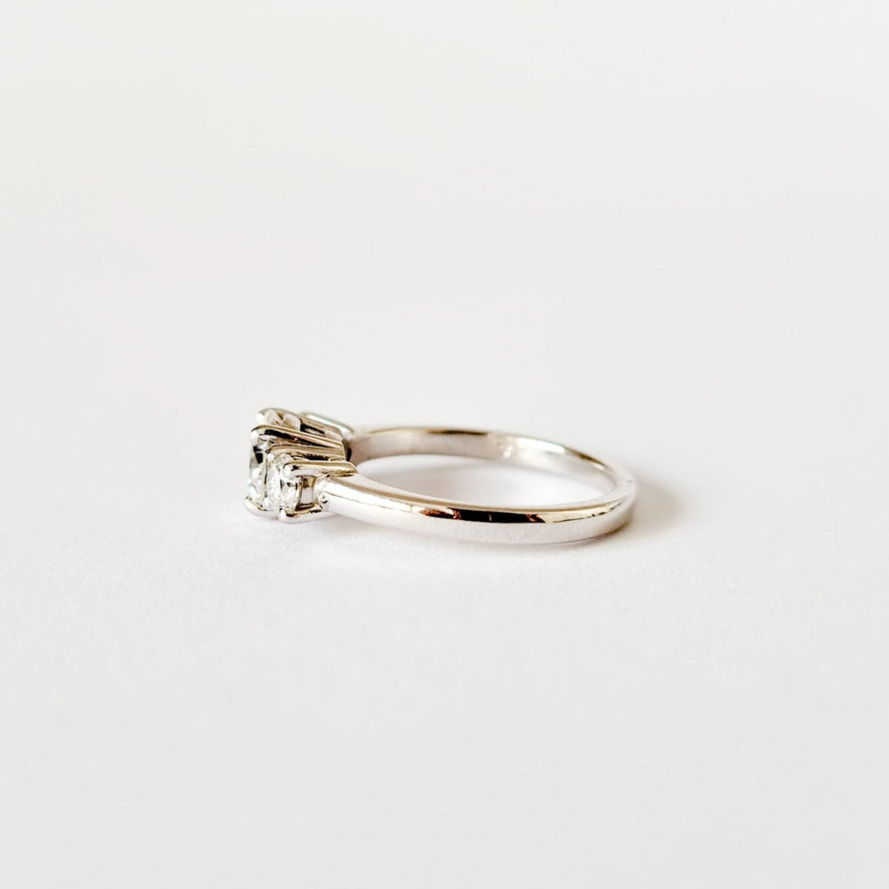 With a total carat weight of 1.10 and a 2mm slightly tapered band, this ring is sure to catch eyes. Handmade from 9k Gold or Sterling silver and featuring one 6mm and two 3.5mm round Moissanite stones, it is the perfect choice if you like the trilogy look in lovely, smaller proportions.
