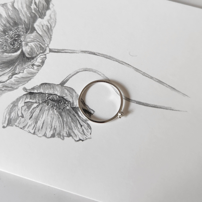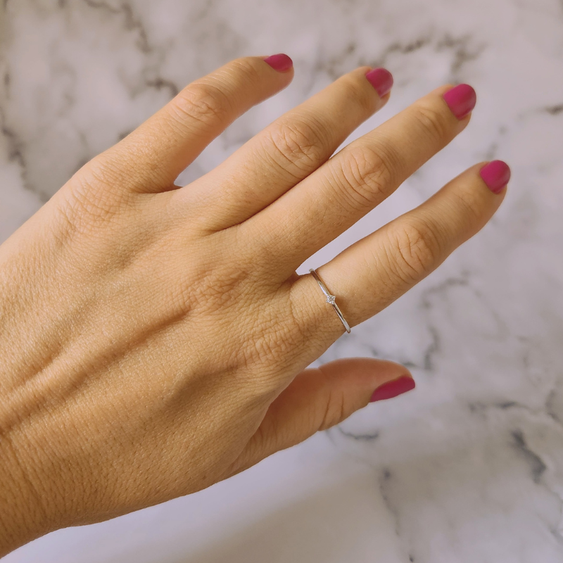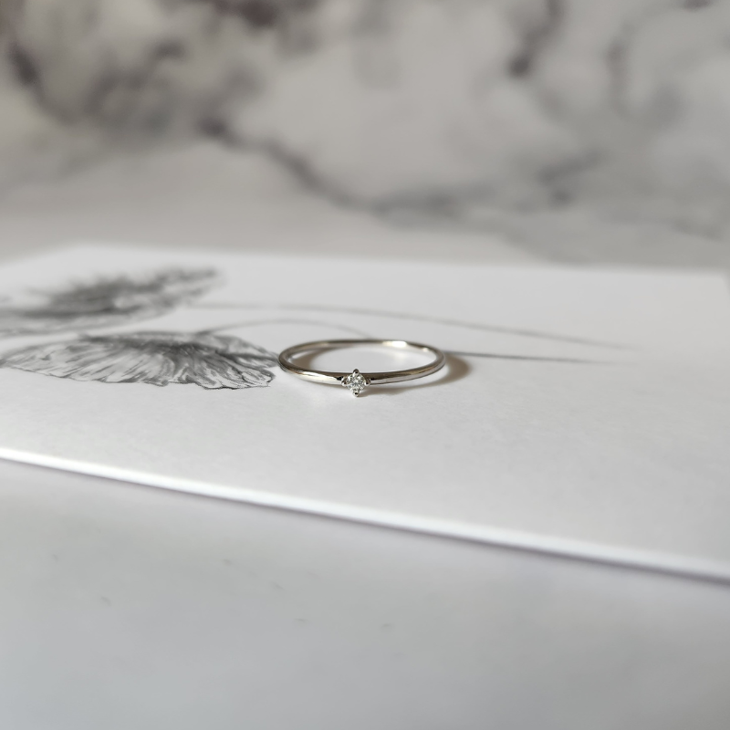 A delicate ring crafted from the finest 9k gold or sterling silver. Featuring a petite 2mm round moissanite, this ring is a must-have for your ring stack.