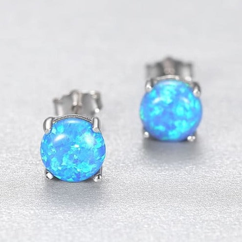 These classic 6mm round studs come in sterling silver, each earrings featuring a unique blue opal.