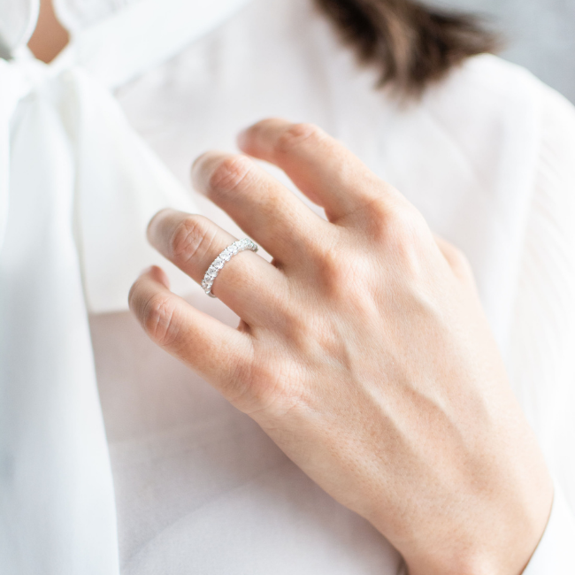 With 10 x 3mm round moissanite stones, this ring boasts a total carat weight of 1.00 cts. Made with high-quality sterling silver, this ring is also available in gold by request. Perfect for those who want to add a touch of sparkle to their everyday outfits or for the ultimate wedding band!