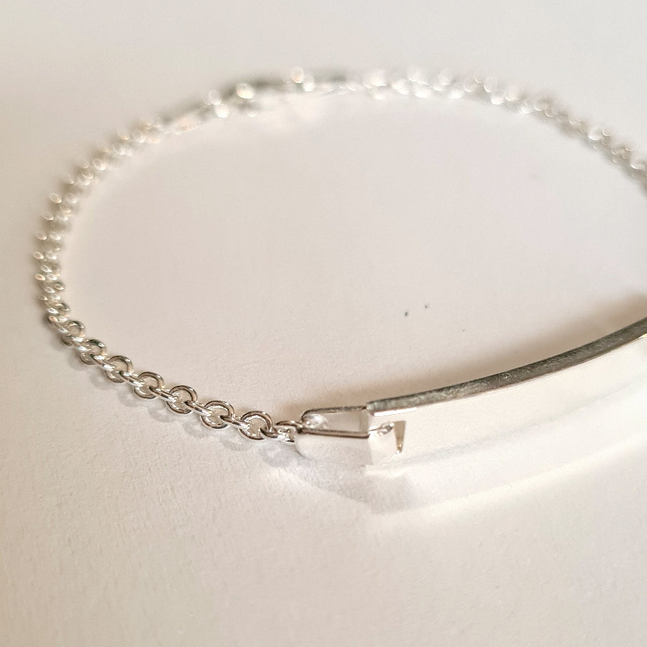 Solid sterling silver bar ID tag bracelet on a rolo chain.
